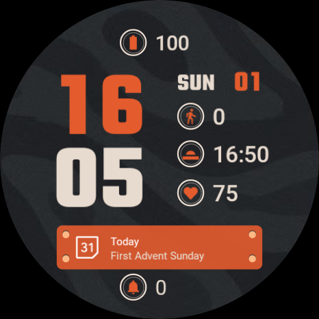 Wear OS 시계용으로 구성 가능한 6개의 정보 표시 시계 모드가 포함되어 있습니다. 시계 모드에 필요한 데이터를 얻으세요. 고도로 구성 가능한 시계 모드.