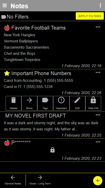 광고, 계정 또는 인터넷 연결이 필요하지 않습니다. 모든 것이 앱에 로컬로 저장되며 안전하게 보관할 수 있습니다! 백업, 다른 사람과 공유 또는 텍스트 편집기에서 직접 편집하기 위해 사람이 읽을 수있는 개방형 형식으로 데이터를 내보낼 수도 있습니다!