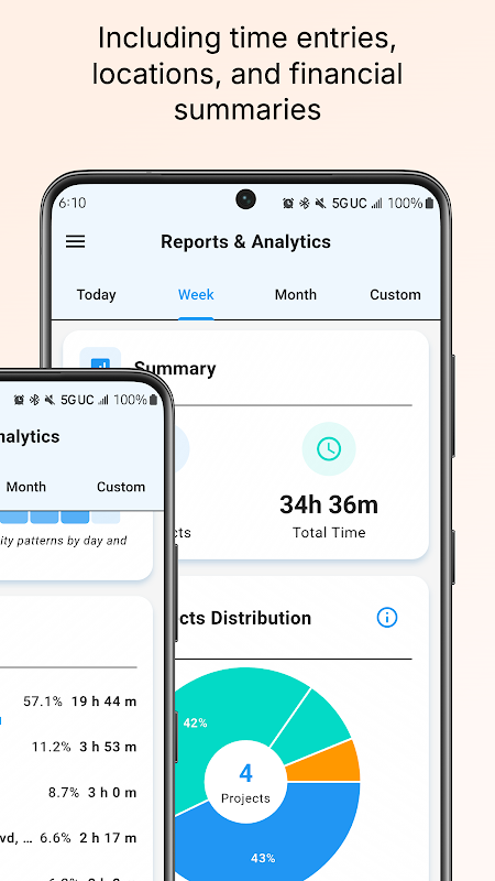 📊 강력한 분석 및 보고서 • 생산성 패턴을 보여주는 시각적 대시보드 • 일별, 주별, 월별 시간 분포 차트 • 프로젝트 비교 분석 • 대상 분석을 위한 사용자 정의 가능한 날짜 범위 • 청구 및 회계를 위한 세부 CSV 보고서 내보내기 • 다른 시스템에서 기존 시간 추적 데이터 가져오기 • 전문 보고서를 위한 태그 기반 필터링
