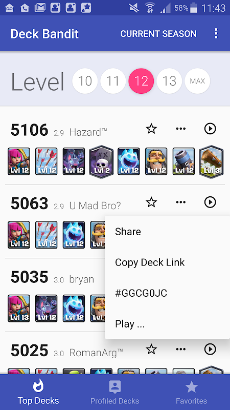 카드 및 카드 수준의 모든 데크를 검색 할 수 있습니다. 당신의 마음에 드는 카드를 기반으로 프로파일을 생성하고 최고 선수의 진행을 따릅니다.