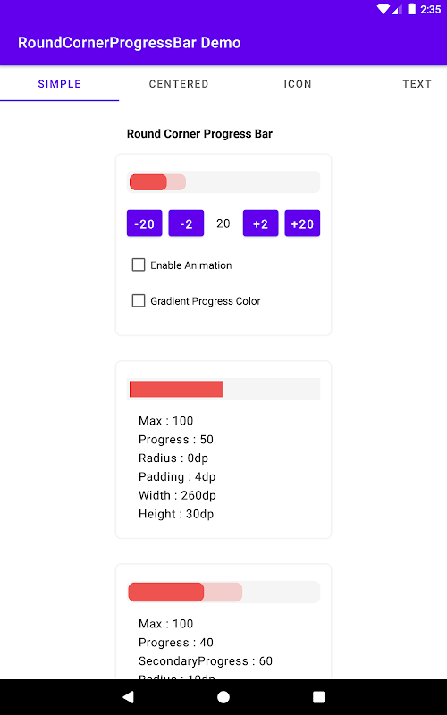 RoundCornerProgressBar 라이브러리로 앱을 더욱 아름답게 만드십시오. 라이브러리가 수행 할 수있는 작업에 대한 데모 앱입니다.