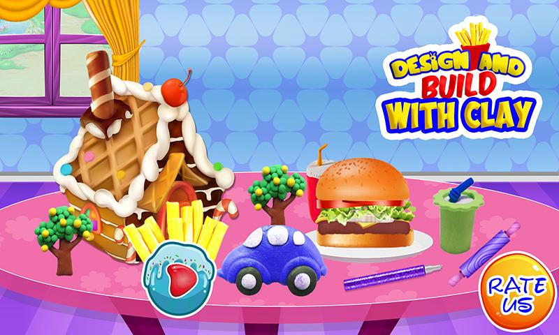 Put some small fragments on the clay as hamburger scraps with your decoration & designing skills. After that, come to design the inner layers. Choose one red clay or multi colors layers and make it to round shape as unicorn rainbow slime making games. Next step, you need to design green vegetable layer. At last, it will be the layer of chicken and ham parts. You need to use the tools to make some holes on the chicken clay and cut the ham crazy fluffy clay parts to several small square parts. If you have chosen to design small house or toy car, you can use the same methods to design with your architecture skills in Design & Build with Clay. At the end of the game, come to assemble the hamburger, candy house or toy car layer by layer & decorate the table with other food items. Show us your rainbow slime maker DIY design at last with full decoration.