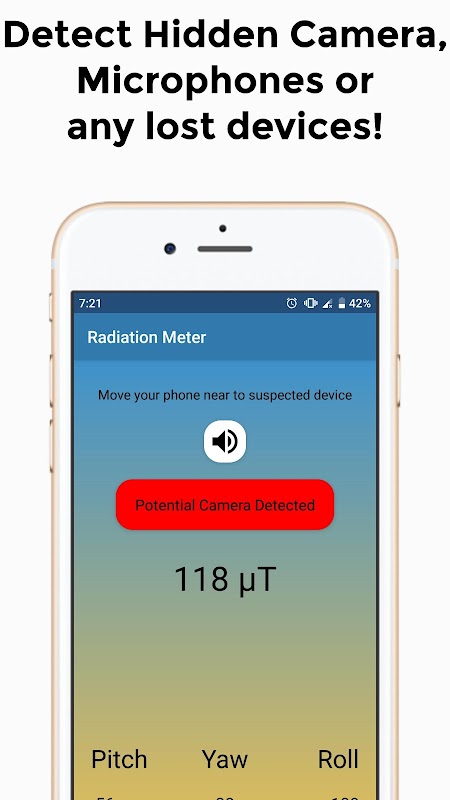 Our app provides the best feature of hidden camera detection and is the solution to detect hidden cameras and microphones. We use a specially developed algorithm to detect hidden camera around you. This app gathers the radiations from your surroundings and compare them with the radiations of a real camera. If they match we give you a warning alarm.
