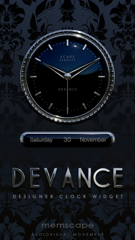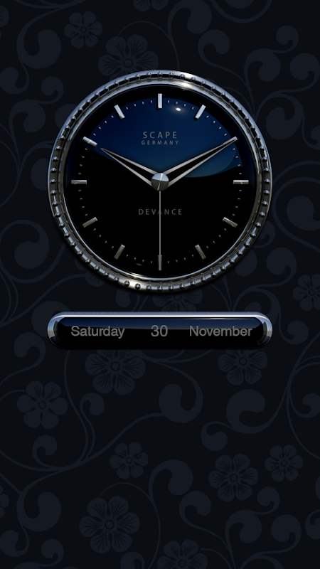 The DEVANCE Analog Clock Widget has optionally a second hand as well as a date display. The clock is in a classic style, with midnight blue surfaces and silver metallic elements. For the widget there are several suitable backgrounds to choose from. The clock has a high resolution (HD) and is scalable on the home screen.