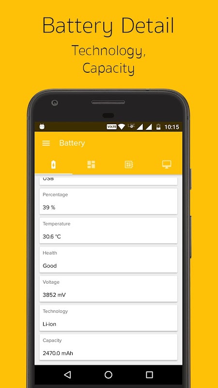 (배터리 상태, 상태, 백분율 레벨, 온도를 충전, 건강, 전압 값 (mV), 기술, 용량 - 크기 (MAH))