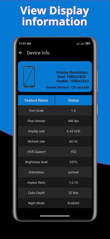 휴대폰 또는 태블릿에 대한 모든 정보(브랜드, 모델, Android 버전, 화면 해상도 등)를 확인하세요.