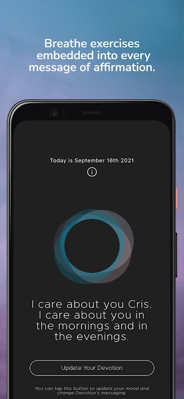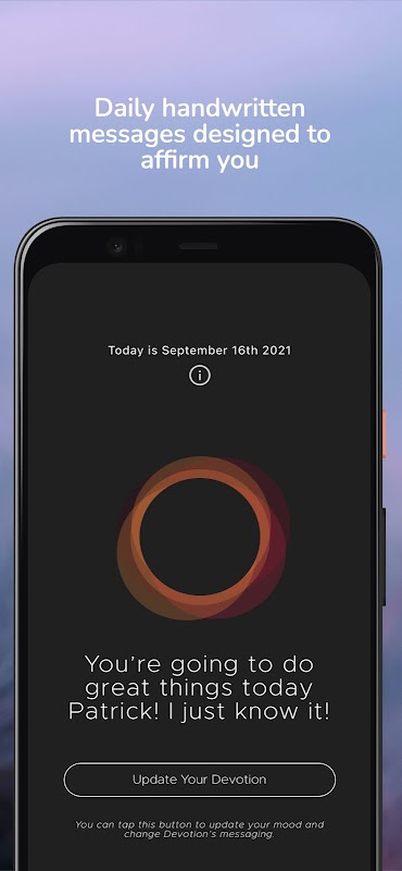Devotion은 사용자의 성별과 기분에 따라 사랑하는 사용자를 위한 메시지를 맞춤화하는 Embrace의 긍정 도구입니다.
