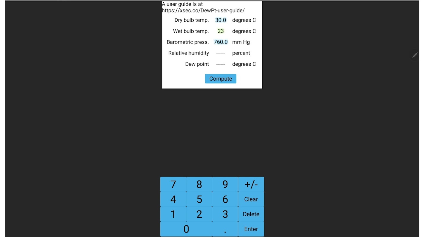 이 앱은 습구 온도, 건구 온도, 기압을 입력받아 이슬점 온도와 상대 습도를 계산합니다. 기압계를 사용할 수 없는 경우, 수은주 760mm를 추정하면 대략적인 결과를 얻을 수 있습니다. 온도는 섭씨 온도(°C)이고 기압은 수은주 mm입니다.