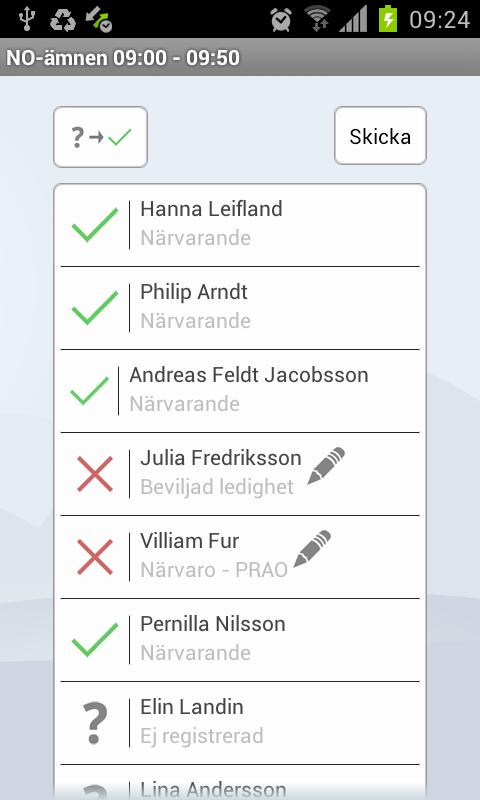 교사는 쉽게 예약 기의 유무를 입력 할 수있다. 교사를 바탕으로 현재 일정 항목이 빠른 선택을 위해 상단에있을 서명합니다. 일전에 이미 구현 수업은 목록에서 선택할 수 있습니다. 이 회고에 가서 유무를 기록 할 수있을 것입니다. 그것이 퓨필의 부재를 나타내는 경우없는 부가 정보에 대한 이유에 따라, 주 이유있는 기회를 가지고. 학생은 전자가 표시되기 때문에 결석으로 등록 및 교사 로그에 표시 목록됩니다.