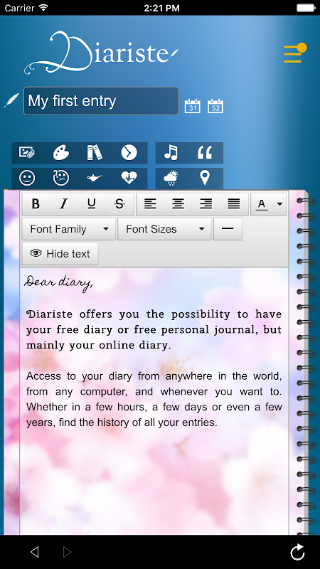 Diariste.com offers you the possibility to have your free diary or free personal journal, but mainly your online diary. Access to your diary from anywhere in the world, from any computer, and whenever you want to. Whether in a few hours, a few days or even a few years, find the history of all your writings.