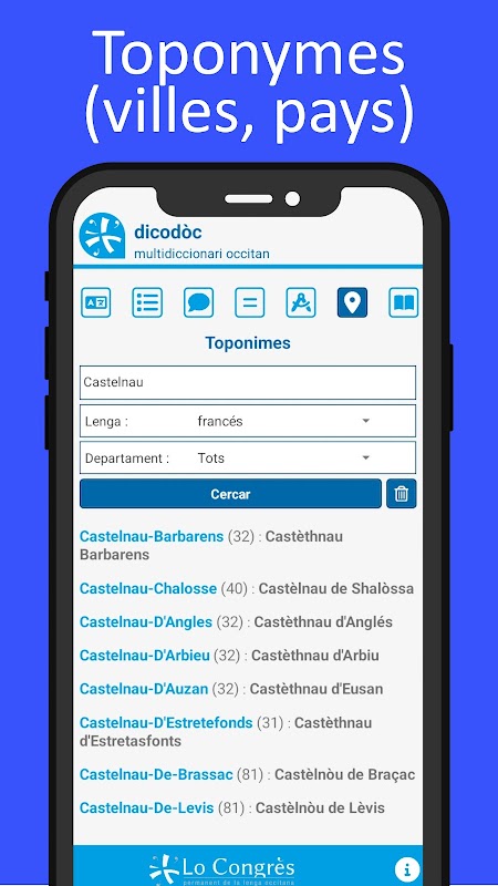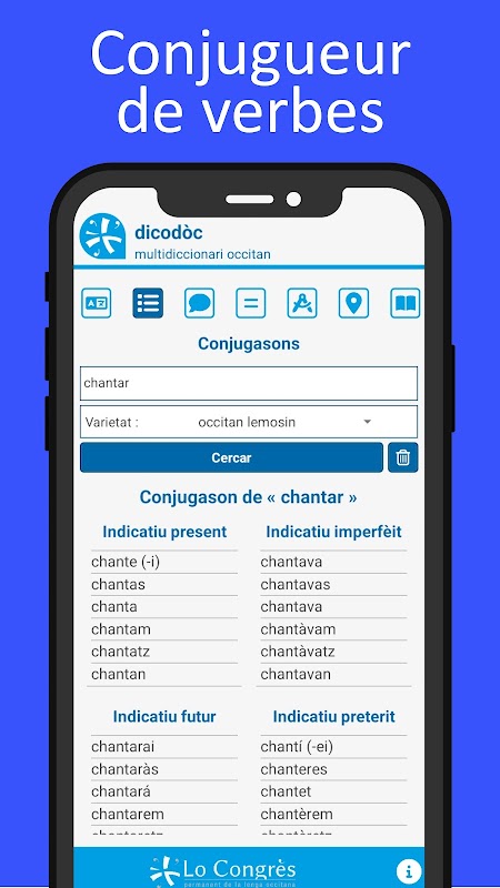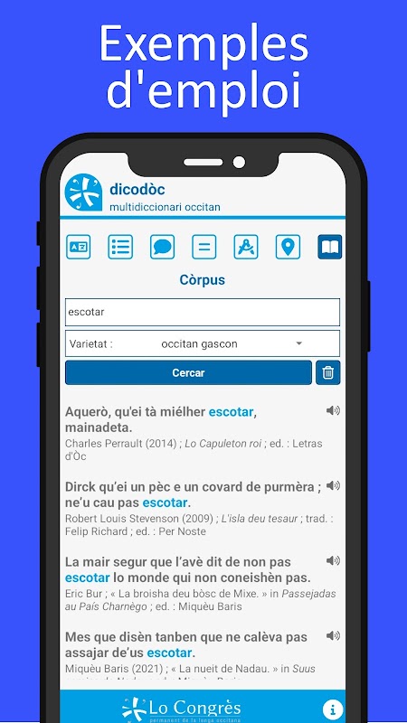 Dicodòc은 Occitan의 스위스 군용 칼입니다: 번역 사전, 동사 변화표, 관용 표현, 동의어, 특수 어휘, 지명, 오디오와 함께 사용되는 단어의 예.