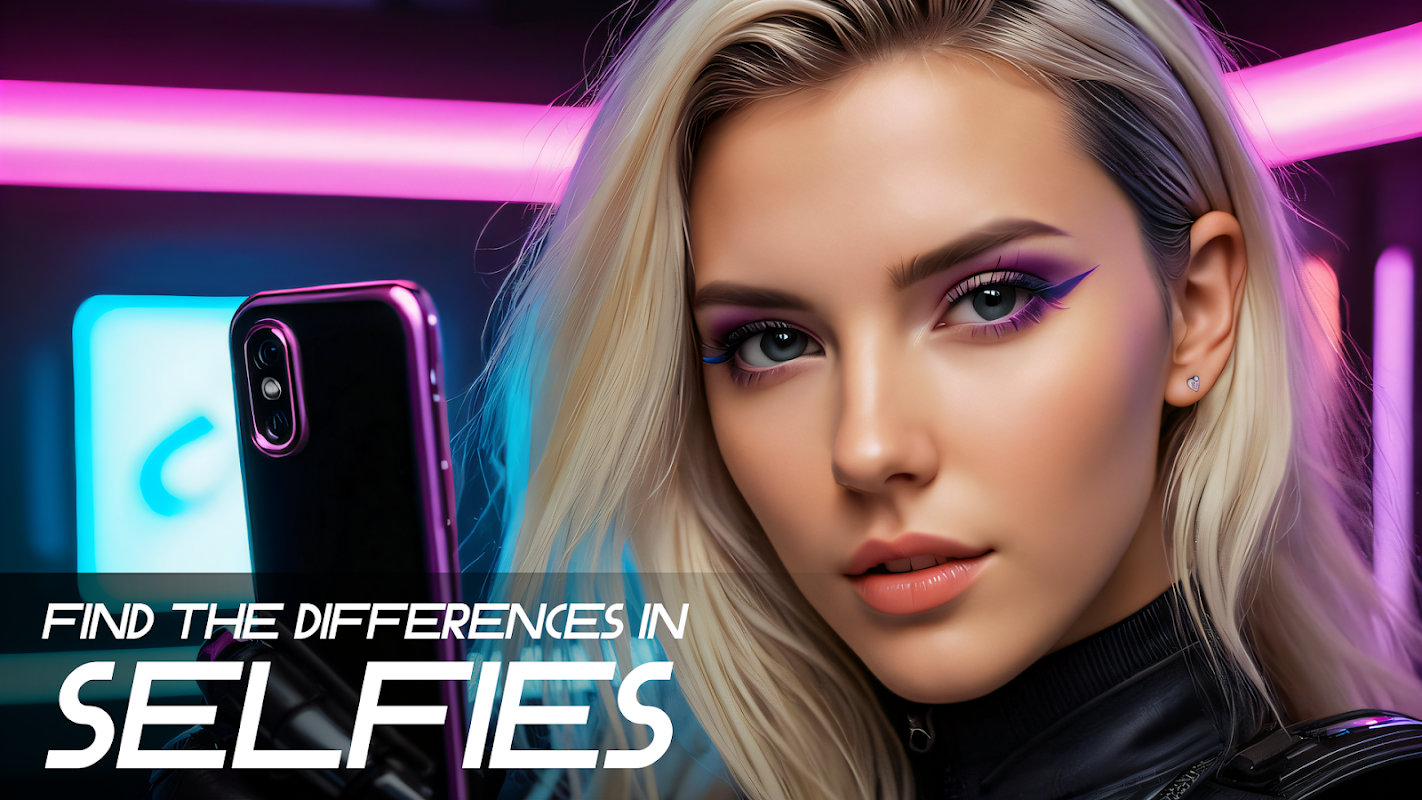 게임 '셀카의 차이점 찾기'. 잘 생긴 남자, 아름다운 여자, 네온 스타일의 흥미로운 장소입니다. 서두를 필요가 없습니다. 시간은 무제한입니다. 집중력, 주의력, 지능을 훈련하세요.