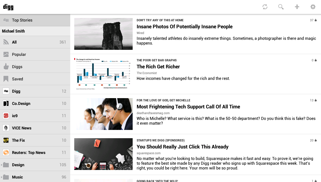Digg delivers the most interesting and talked-about stories on the Internet. Powered by social signals and old-fashioned human judgment, our editors turn the Internet's vast and cacophonous flood of articles, blog posts, magazine pieces, status updates, photos and videos into the elegant and endlessly engrossing mix known as Digg. And now the new Digg Reader is a simple, powerful and speedy way to follow your favorite sources and publishers.