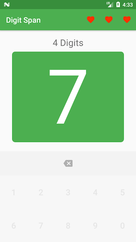 숫자 범위 시험은 작업 메모리의 다수의 저장 용량을 측정하는 데 사용된다. 당신이 순서를 기억하라는 메시지가 표시됩니다 후 수치 일련의 숫자가 표시됩니다. 각 성공적인 시도 후, 숫자의 수는 1 씩 증가합니다. 각 시도 실패 후, 숫자의 수는 1만큼 감소하고, 수명이 손실됩니다. 세 가지 삶을 잃은 후, 가장 성공적인 시도는 숫자 범위로 계산됩니다.