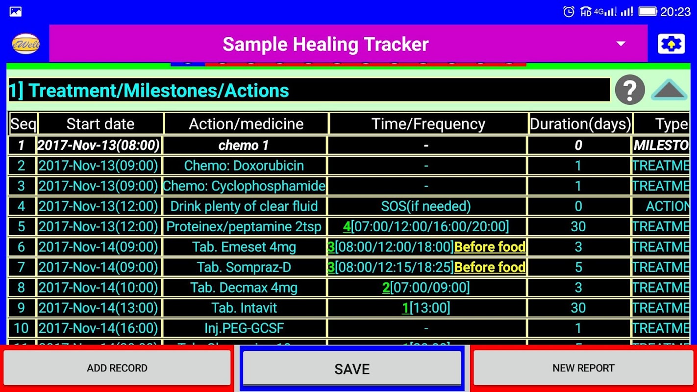 Managing prescriptions/treatment plans - Tracking and reminding medicine/action timings, chart indicating active/inactive days of each medicine with total doses taken and remaining, description and side effect of each medicine etc.
