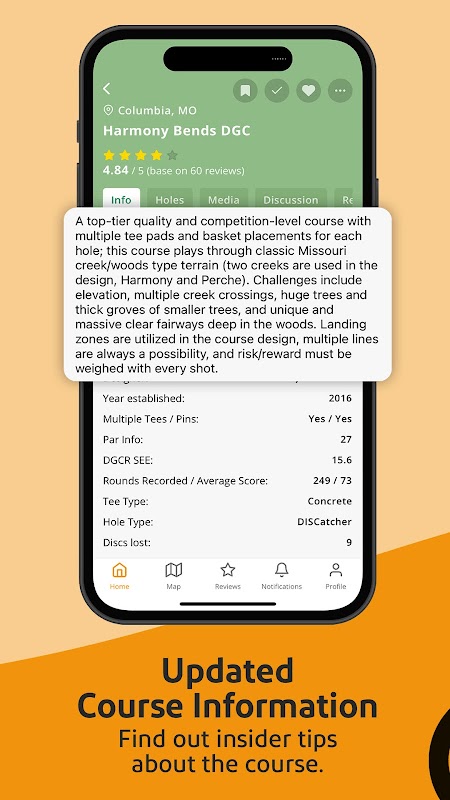 공식 DGCourseReview (DGCR) 응용 프로그램을 제공하는 점수 추적 및 (운전 경로 포함) 과정 설명, 위치, 홀 / 파 세부 사항, 거의 모든 디스크 골프 코스지도, 100,000 물론 사진과 60,000을 포함하여 가장 최근의 포괄적 인 디스크 골프 코스 정보 + 6000을 통해 코스의 코스 리뷰 (성장!).