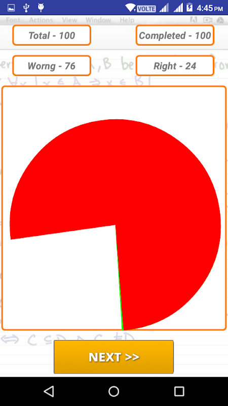 세션의 끝에서, 원형 그래프와 함께 결과를 표시한다. 당신은 당신의 친구와 함께이 결과를 공유 할 수 있습니다. 당신이 주제에 대한 자세한 내용을 원한다면, 앱도 무료로 튜토리얼을 보유하고 있습니다. 이것은 이산 수학 시험을 준비하는 포괄적 인 도구입니다.