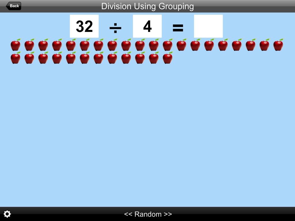 In this app division is illustrated by dividing number apples into groups. If, for instance, the division problem (which appears at the top of the screen) is 18 ÷ 2 =, the student will be told to click on the first number (18) and 18 apples will appear on the screen. The student will then click on each of the apples (which will be blinking). The apples will go into numbered boxes (two per box) at the bottom of the screen. The number of the last box is the answer. The student clicks on the last blinking number, which rises into the number statement. The program voice states “Eighteen divided by two is nine” and 9 appears in the answer space