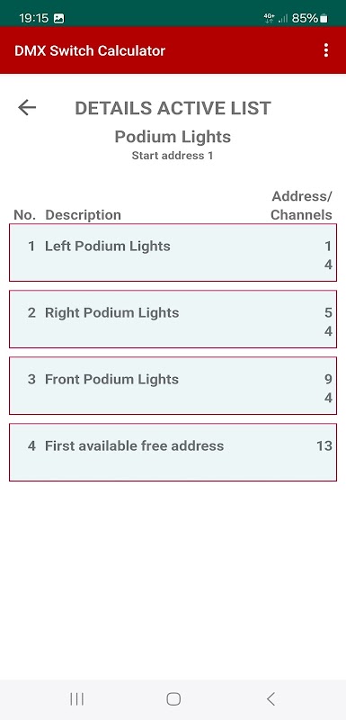 DMX 장치의 주소와 채널을 표시하는 쉬운 앱입니다. 당신이 해야 할 일은 첫 번째 DMX 장치의 시작 주소를 입력하고 연결하려는 각 DMX 장치의 채널 수를 입력하는 것입니다.