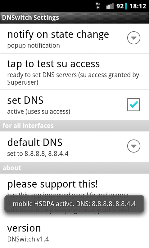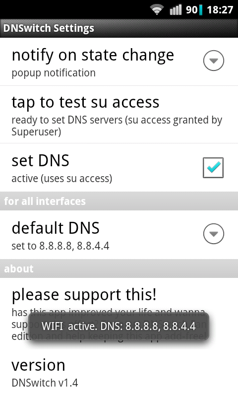 * Receiving notification on the current DNS setting without checking 'set DNS' may help to test your device for proper configuration and/or if it receives correct settings from your network. This feature works on devices without root.