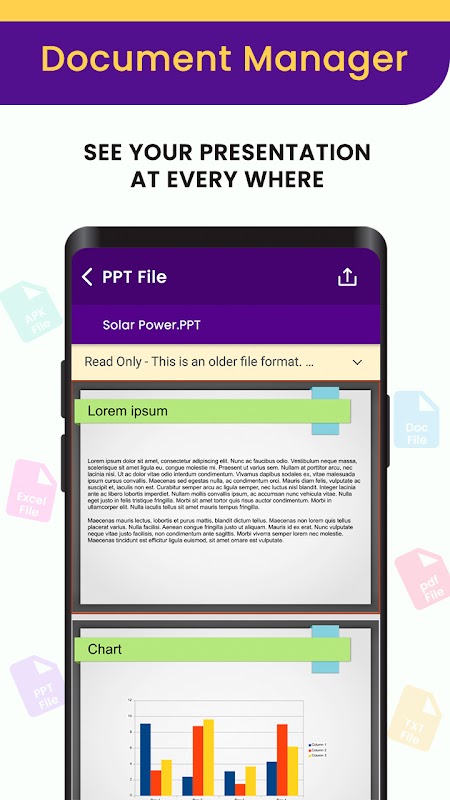 Document Reader and Document Viewer for your phone lets you easily view Word, Excel, PowerPoint, Text and PDF files. It also supports multiple compatibility with office formats including DOC, DOCX, XLS, TXT, XLSX, PPT, PPTX and PDF.