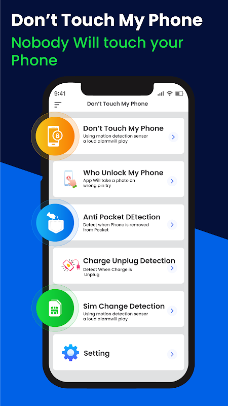 최첨단 스파이 방지 탐지 기술을 활용한 "내 전화에 손대지 마세요"는 도둑을 신속하게 탐지할 수 있습니다. Don't Touch My Phone은 전화 알람 소리와 낯선 사람 알림 알람으로 장치를 변경하여 도둑으로부터 높은 수준의 보호를 제공합니다.
