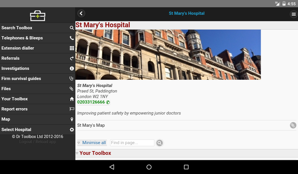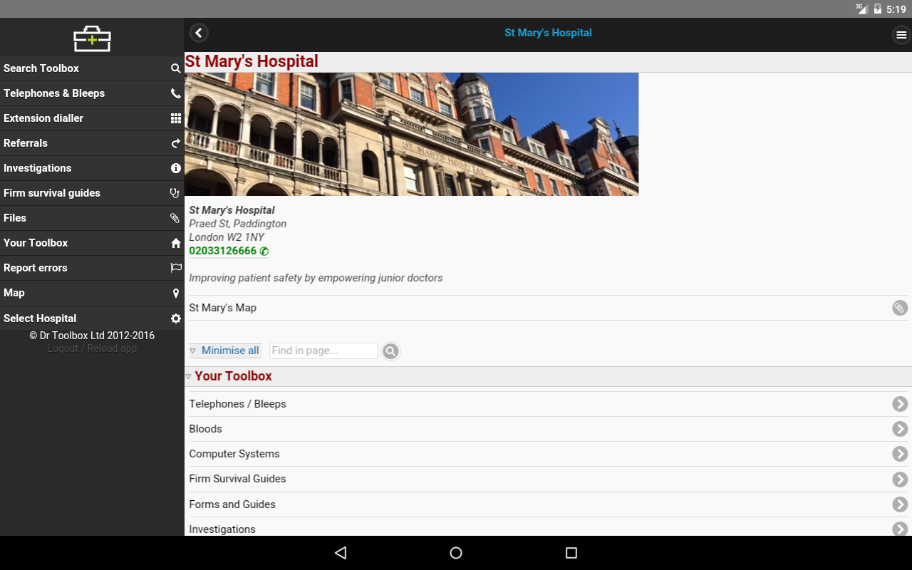 Dr Toolbox is a secure online information resource set up by trainee doctors to help to better orientate themselves with their hospital and department. It includes bleep numbers, referral methods & guides. This app saves the information retrieved from the website for offline usage, including offline search.