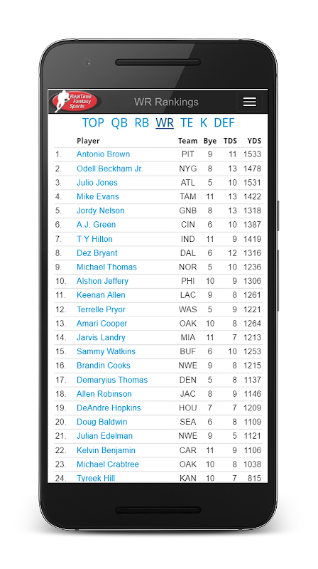 업데이트된 뉴스, 속보 알림, 플레이어 노트, 분석은 물론 전문가 순위, ADP 및 경매 가치가 포함된 판타지 축구 드래프트 가이드입니다. 모든 정보는 RealTime Fantasy Sports를 통해 매일 업데이트됩니다.