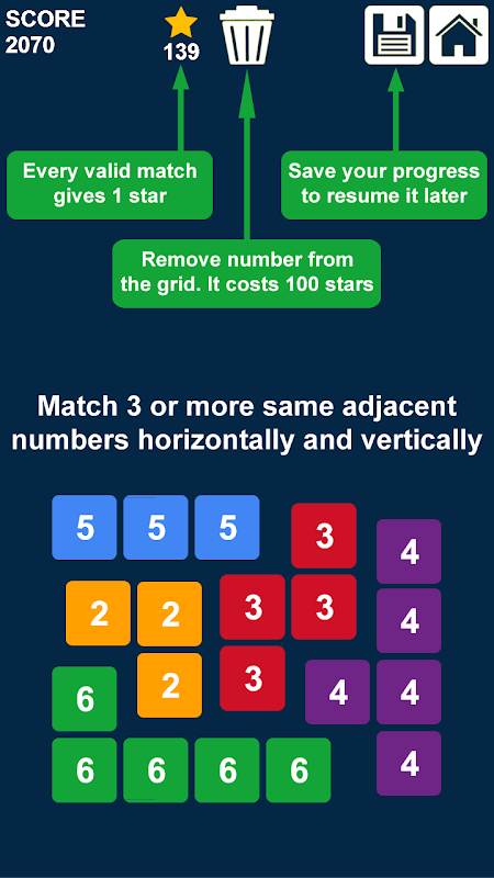 보드에서 숫자를 드래그하여 3 개 이상의 인접한 숫자와 일치시킵니다.