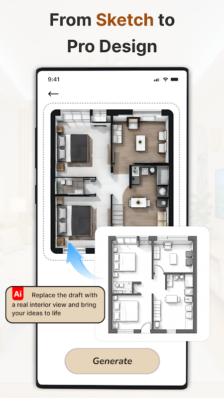 이 과정은 마법처럼 간단합니다. 종이에서 휴대폰으로의 이동이 매끄럽습니다. Snap your design 기능을 사용하여 평면도 스케치나 방 레이아웃을 캡처하세요. 저희의 고급 AI 이미지 인식 기술은 사용자가 그린 선, 모양, 공간을 정확하게 해석합니다. 수년간의 디자인 경험이 필요 없습니다. 대략적인 건축 스케치든 상세한 인테리어 디자인 도면이든, 저희 AI는 사용자의 비전을 이해하도록 설계되었습니다.