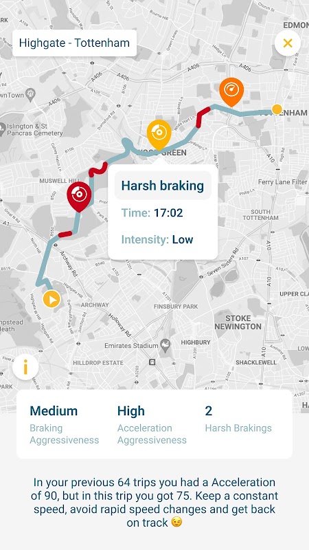 Drive Safe는 운전자에게 운전이 이상적이지 않은 부분을 지적하면서 모든 여행에 대한 완전하고 상세한 분석을 제공합니다.