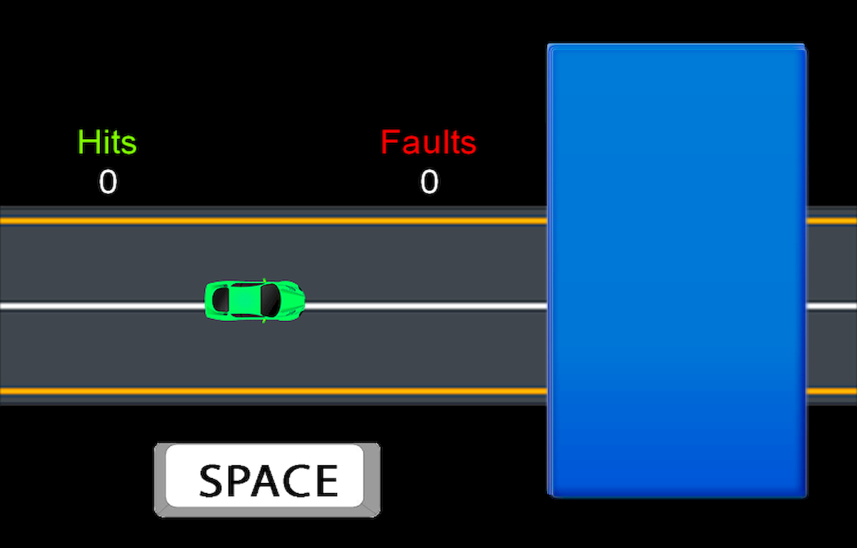 - 차량은 일정한 속도로 출발합니다. 횡단할 때 일종의 다리처럼 숨겨져 더 이상 차량이 보이지 않습니다. 속도를 계산하고 버튼이나 스페이스 키를 터치하기만 하면 됩니다. 차량을 정지시키다, 차량이 떠날 때를 생성할 때