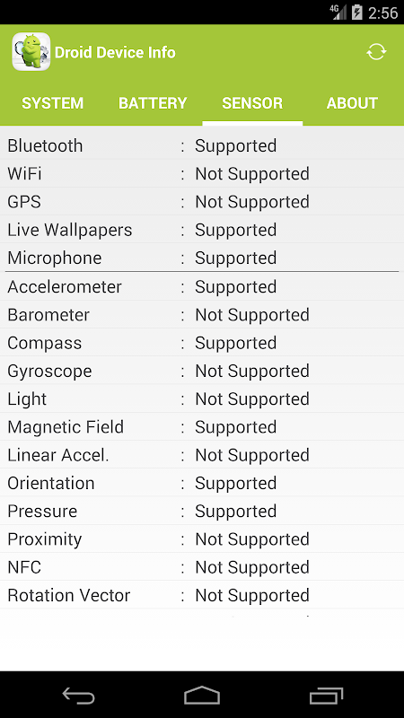 • 시스템 : 안드로이드 버전, API 레벨, 안드로이드 ID, 커널 아키텍처, 재부팅 이후 ID, 런타임 값, 루트 액세스 커널 및 시간을 구축