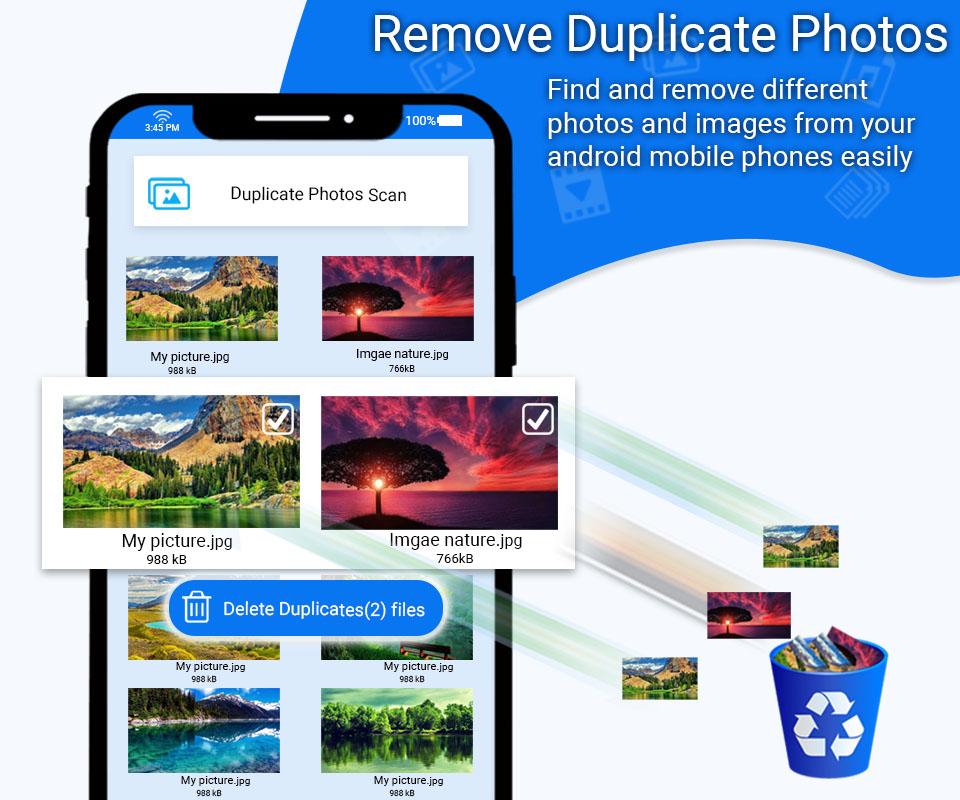 중복 된 사진 제거기 또는 중복 된 사진 삭제 : 이중 파일 정리 앱을 사용하면 중복 된 사진을 안드로이드 폰에서 스캔 할 수있는 것처럼 모든 중복 된 파일 또는 카테고리 현명한 중복 파일 스캔을 쉽게 찾아 제거 할 수 있습니다. 사진 클리너 및 복제 된 사진 제거 기능으로 중복 된 사진을 위해 전화기를 청소할 수 있습니다.
