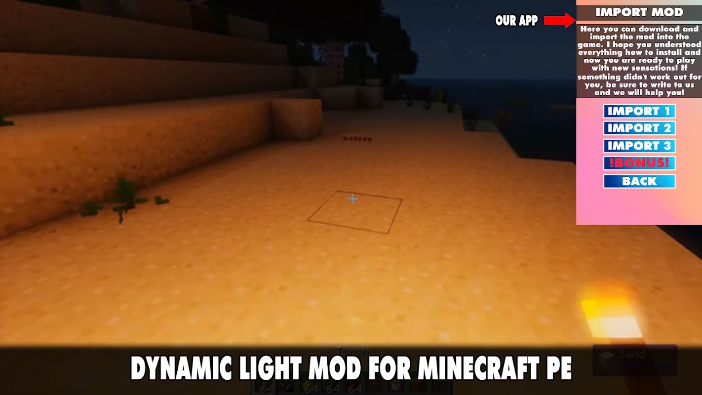 ❗❓Dynamic Light Mod for Minecraft PE❗❓😋 Experienced Minecraft players who have tried the Java version know about the Optifine add-on that improves the lighting in the game. The assembly brings a smooth and soft light that enhances the graphics. The Dynamic Lighting mod works in a similar way, but already in the pocket version. In addition, players will be able to carry lighting devices in their hands and illuminate the space around them. You no longer have to put torches or blocks - just pick them up.😋
