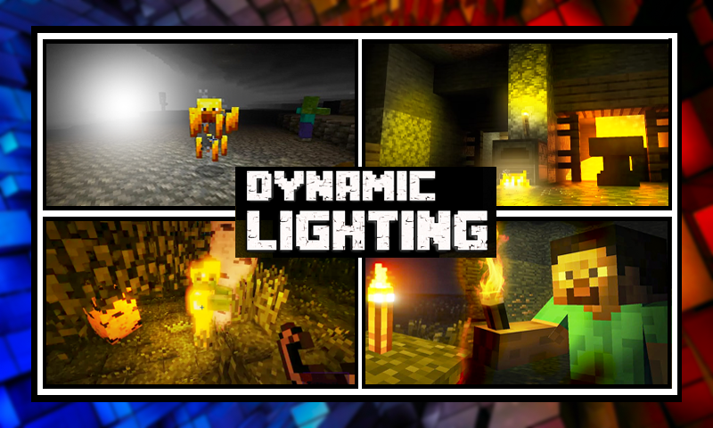 mincraft PE용 애드온의 동적 조명은 횃불이나 용암 양동이와 같이 빛을 발산할 수 있는 항목으로 구성되어 있으며, 이러한 항목을 손에 들고 있으면 주위에 불이 들어옵니다.