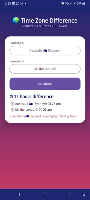 이 앱을 사용하면 지원되는 국가 간 시간대를 비교하고 선택한 각 지역의 현재 현지 시간을 명확하게 확인할 수 있습니다. 또한 일광 절약 시간제(DST) 적용 여부도 표시하여 정확한 계산 결과를 제공합니다.