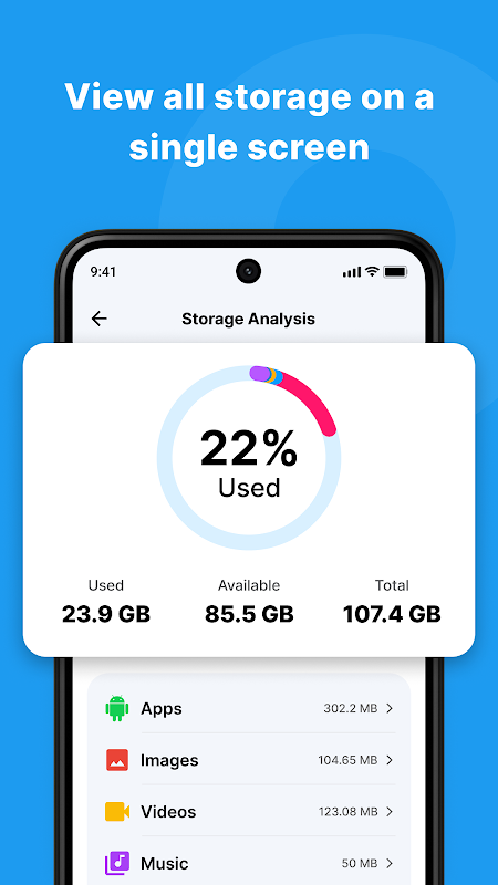 내부 메모리, SD 카드, USB, 클라우드 저장소(연결된 경우)를 포함한 모든 저장소 공간에 액세스하고 관리하세요.