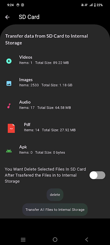 - 한 번의 클릭으로 휴대폰과 SD 카드 간에 오디오, 비디오, 이미지, PDF 및 APK 파일을 쉽게 전송할 수 있습니다.