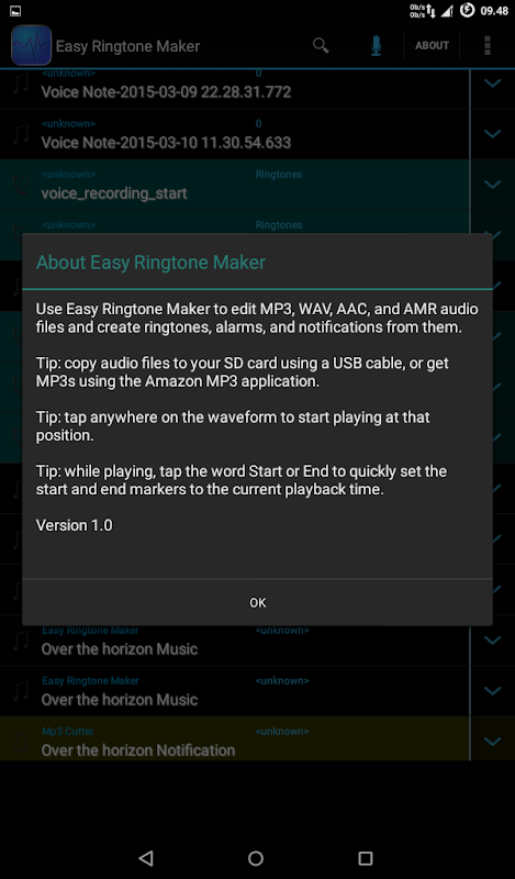 Jadikan MP3 ringtone di smartphone Anda dengan mudah menggunakan aplikasi ini. Anda juga bisa merekam langsung Audio anda sendiri kemudian melanjutkan proses editing secara gratis. Easy Ringtone Maker support berbagai sound file type seperti MP3, WAV, AAC, AMR dan format musik lainnya.