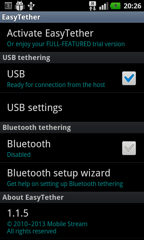 컴퓨터, 태블릿 또는 라우터와 스마트 폰에서 EasyTether 공유 인터넷 연결.