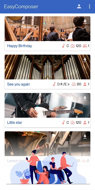 EasyComposer allows you to compose a song with a small group of people online. Each member in the group is responsible for a single track. You can tap your notes in the track with the most favorite instrument. In the end, all the tracks are put together to make up the song.
