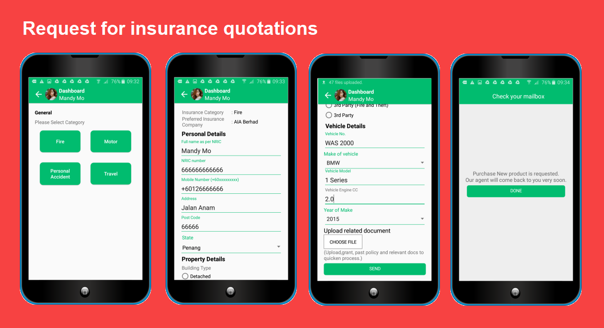 This app provides a platform for customers to receive an quote in quicker response for comparison for their insurance needs. Customer simply submit their insurance requirement using the app, the request will be sent to 3 nearest agents , who will provide the budgetary quote, based on the request. Once the customer selected the quote of his*/her* choice, both the agent and customer's details will be revealed. Customer able to receive one-on-one service by the agent.