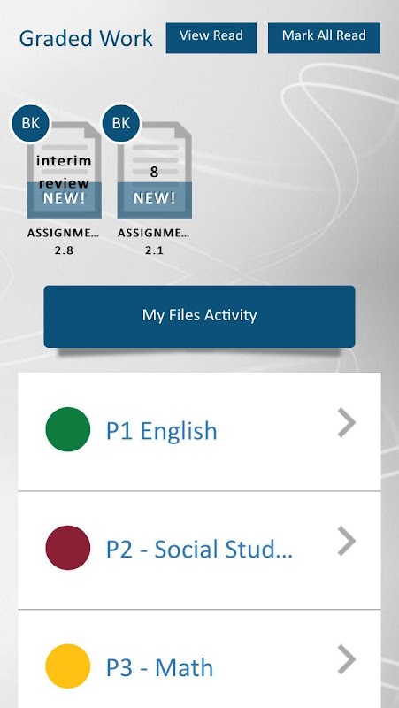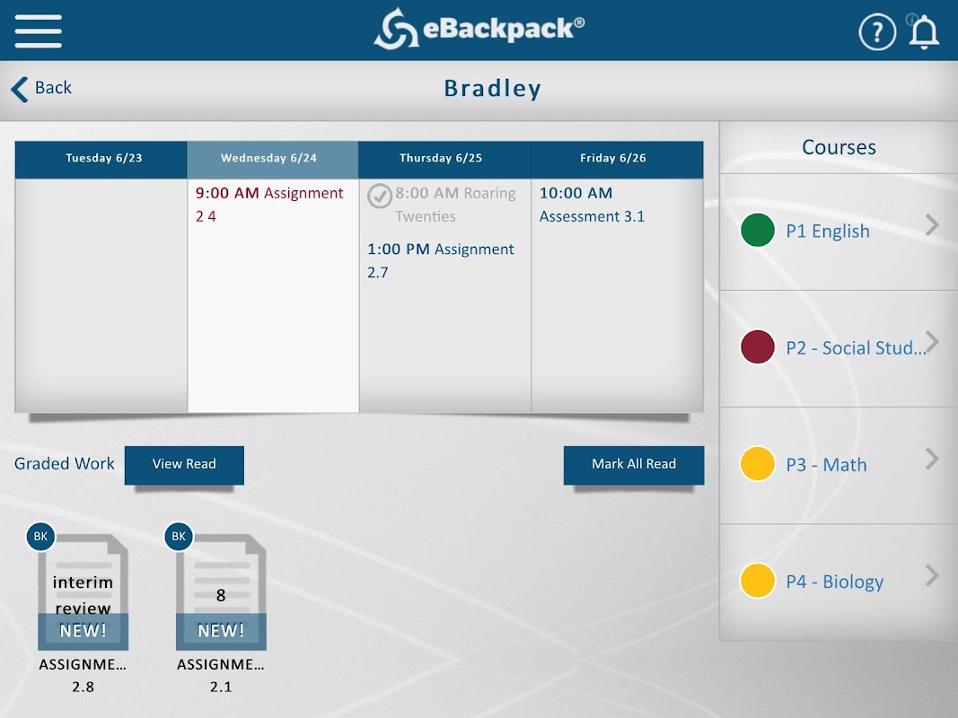 eBackpack for Parents provides easy access to your child's school work with push notifications* (premium feature) to alert you when an assignment is past due or a due soon, a new grade has been returned, and much more. This app allows you to see your child's upcoming assignments, what and when your students submitted something, and the returned reviews; all in real time, not weeks later.