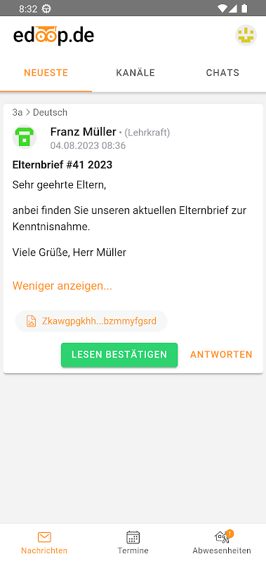이메일 목록과 뉴스 레터는 과거의 일입니다. 오늘날 교사와 학부모는 edoop.de를 통해 안전하고 직접적으로 커뮤니케이션합니다.