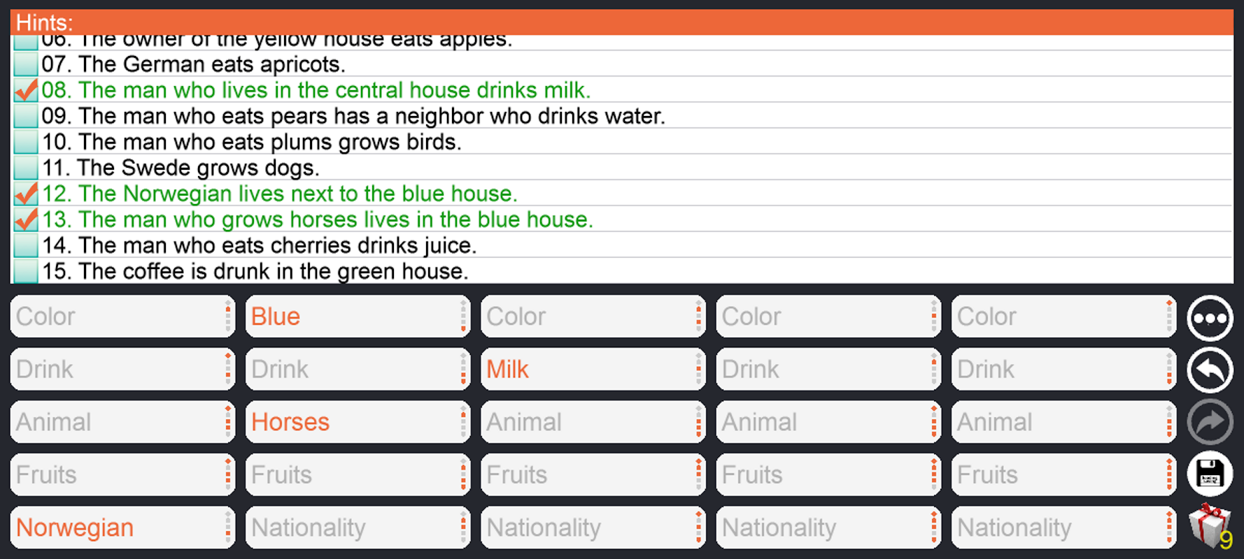 아인슈타인의 수수께끼 - 전설에 따르면 알베르트 아인슈타인이 어린 시절에 만든 논리 퍼즐입니다. 아인슈타인은 보조원 후보자의 논리적 사고 능력을 테스트하기 위해 사용했습니다.