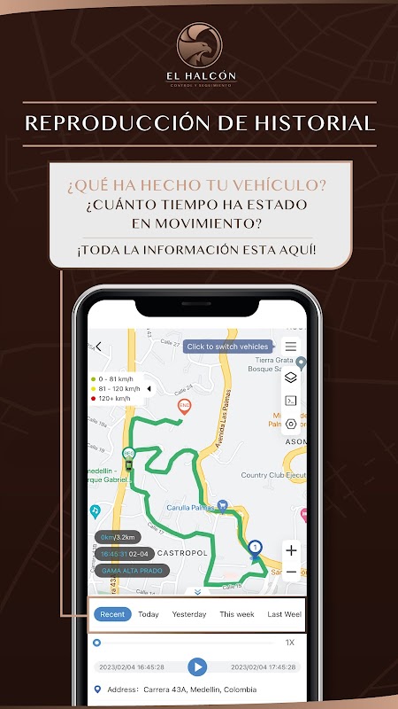 El Halcón에서는 클릭 한 번으로 GPS 이상의 기능을 제공합니다. 안전과 신뢰를 드립니다. 차량을 완벽하게 제어할 수 있는 모든 도구. 10초마다 전송되므로 STREEM VIEW 사진을 통해 차량이나 오토바이의 위치를 쉽게 파악할 수 있어 정확한 추적이 가능합니다.