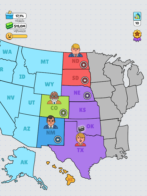 몰입감 넘치는 선거 시뮬레이션 게임으로 정치의 세계로 들어가 보세요! 7개의 고유한 후보자 중에서 선택하고 단 하나의 주를 제어하면서 캠페인을 시작하세요. 영향력을 확대하면서 다른 주의 공직에 출마하고 투표율과 캠페인 자금을 결정하는 중요한 질문에 답하세요. 미국 정치의 복잡한 환경을 탐색할 때 모든 결정이 중요합니다. 당신은 국가의 지도자가 될 수 있습니까? 전략을 세우고, 질문에 현명하게 답하고, 영향력이 커지는 것을 지켜보세요!