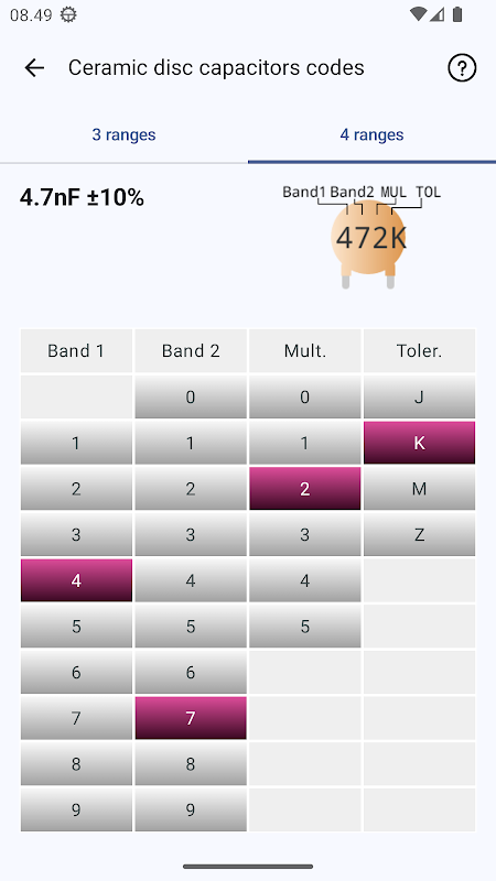 이 앱에는 지원되는 모든 코드에 대한 자세한 도움말 섹션과 설명, 그리고 표준 E 시리즈 값 차트가 포함되어 있습니다.