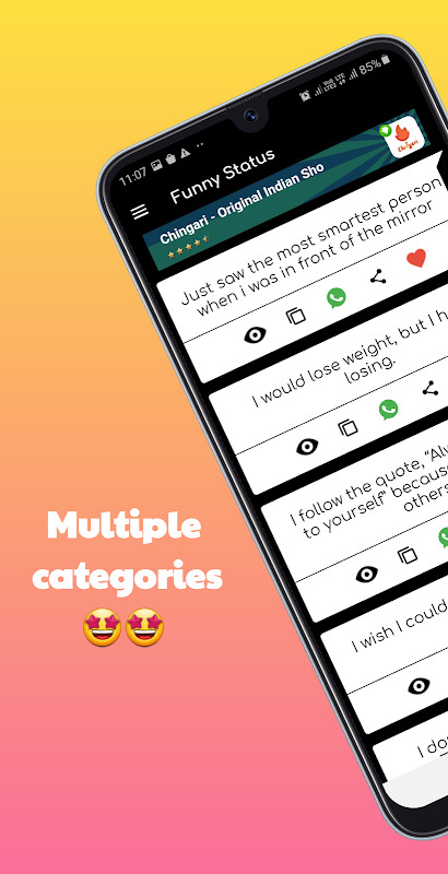 이 앱은 영어로 최고의 상태 수집을 제공합니다. 이 상태로 당신의 사랑을 보여주십시오. 영어로 된 최고의 상태 및 인용문 모음은 WhatsApp 상태, Facebook 상태, Instagram 캡션 또는 기타 소셜 미디어로 사용할 수 있습니다. 좋은 상태를 설정하면 담벼락 게시물의 좋아요가 증가합니다. 멋지고, 미쳤고, 멋지고, 재미 있고, 놀라운 상태 수집을 찾고 있다면 검색이이 상태로 끝나고 앱을 인용합니다.